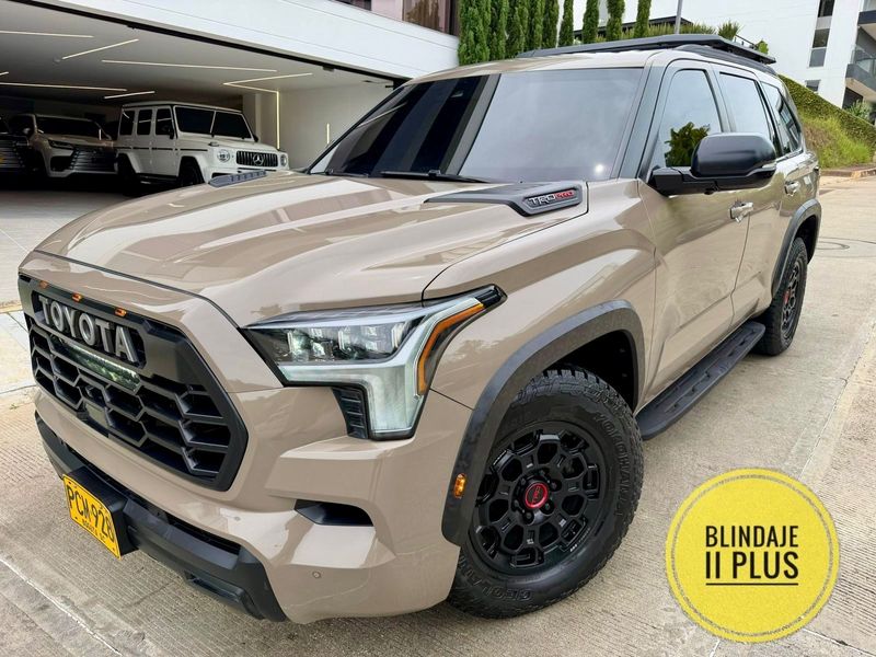 Toyota sequoia Edicion TRD PRO HIBRIDA año 2025 19 mil kms BLINDAJE 2 PLUS! color mudbath motor 3.5 twinturbo hibrido. Version trd pro: suspencion Fox, kit de altura, barra estabilizadora trd pro, rines 18 BBS- FORGET, volante personalizado trd pro, palanca y boton de encendido trd pro, lampara led delantera, cogineria personalizada, ampliacion que terminado especial, exosto deportivo con doble salida trd pro, partilla de techo, mas caballos de fuerza, suspencion mas suave, camaras 360 grados, sonido jbl con bajo, carroseria mas liviana. En el habitáculo, incorpora una tapicería en cuero de 3 filas 7 pasajeros electrica hasta la tercera fila asientos disponen de calefacción, además de ventilación, un techo panorámico y Toyota instaló vidrió acústico en las puertas delanteras para que la cabina sea un poco más silenciosa viene equipada con un motor I-Force Max 3.5L Twin-turbo V6 , que desarrolla 437 caballos de fuerza y 583lb de Torque, Este vehículo tiene capacidad de arrastrar hasta 12.000lb. Equipa Toyota Safety Sense 2.5 , qué incorpora un sistema pre-colision que alcanza a detectar personas , control crucero adaptativo en rango , advertencia de cambio de carril , cambio automático de luces bajas y altas. Sistema de entretenimiento JBL con 12 bocinas internas , Estribos de lujo, retrovisor digital con pantalla , cámaras 360 Grados , suspensión adaptable, calefacción y aire acondicionado en todos los asientos , techo panorámico y cargador inalámbrico, pantalla de c14 pulgadas. ENTREGA INMEDIATA 569.000.000$ Recibo vehículo de menor